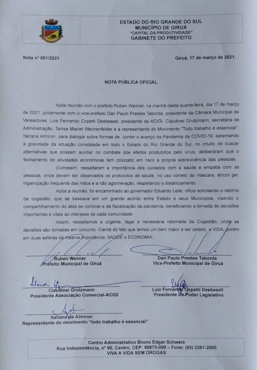 O chefe do Executivo Municipal salienta que a situação é grave, mas que é indispensável o equilíbrio entre a saúde e a economia. “Devemos seguir preservando vidas, por meio da etiqueta respiratória, higiene pessoal e o respeito ao distanciamento, para reduzirmos o número de casos. Manifestamos nosso apoio à abertura do comércio em geral, entendendo que milhares de pessoas dependem do seu emprego para o sustento de suas famílias”, ponderou Ruben Weimer. O documento enviado ao Governador também foi assinado pelo vice-prefeito, Dari Paulo Prestes Taborda, presidente da Câmara de Vereadores, Luiz Fernando Copetti Desbesel, presidente da Acigi, Claudinei Grutzmann e pela representante do movimento “Todo o trabalho é essencial”, Itairana de Almiron.
