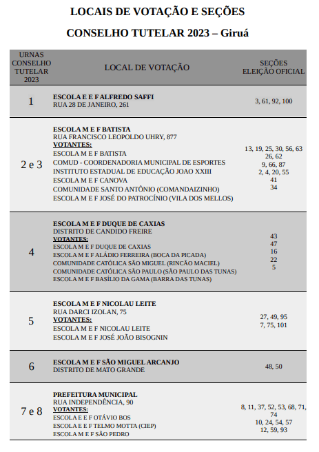 O Governo Municipal através da Secretaria de Administração, presidência do Conselho Municipal dos Direitos da Criança e Adolescente de Giruá-RS (COMDICA) e da Comissão Eleitoral, traz para a comunidade giruaense, informações relevantes para a eleição dos Conselheiros Tutelares que acontece no dia 01 de outubro, das 08h às 17h.