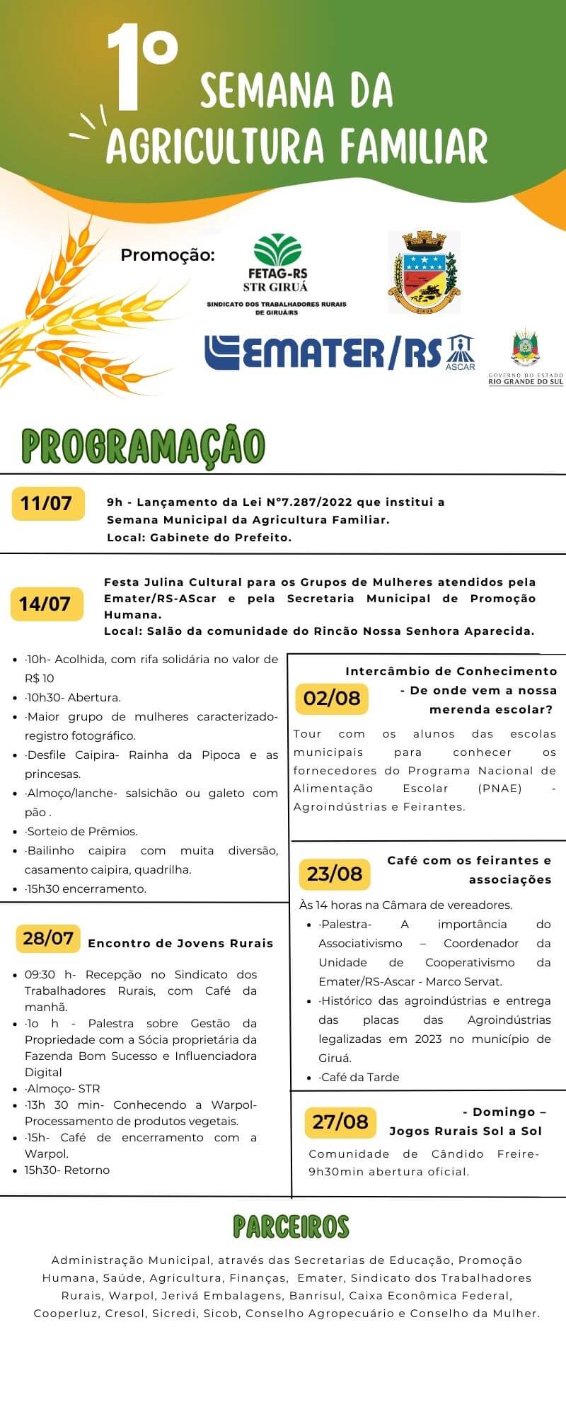 Além de apresentar a programação que está repleta de atividades voltadas para a promoção e difusão da agricultura familiar, sendo promovida com o empenho, investimento e parceria de empresas e instituições como a: Warpol, Jerivá Embalagens, Banrisul, Caixa Econômica Federal, Cooperluz, Cresol, Sicredi, Sicoob, Conselho Agropecuário e Conselho da Mulher; o encontro ainda salientou a importância de levar orientação para fomentar a participação dos núcleos familiares nos Programas de Educação Fiscal e Nota Fiscal Gaúcha.