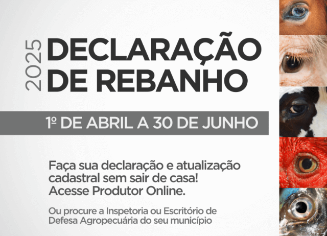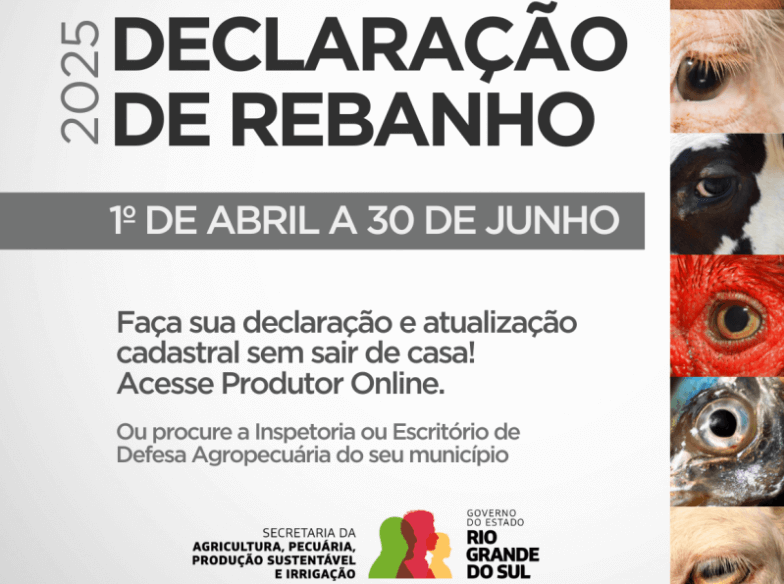 Iniciou na terça-feira, 1º de abril, o período da Declaração Anual de Rebanho. A Secretaria Municipal de Agricultura e Meio Ambiente informa que a declaração é obrigatória e todos os animais existentes na propriedade devem ser declarados, no prazo máximo até o dia 30 de junho.