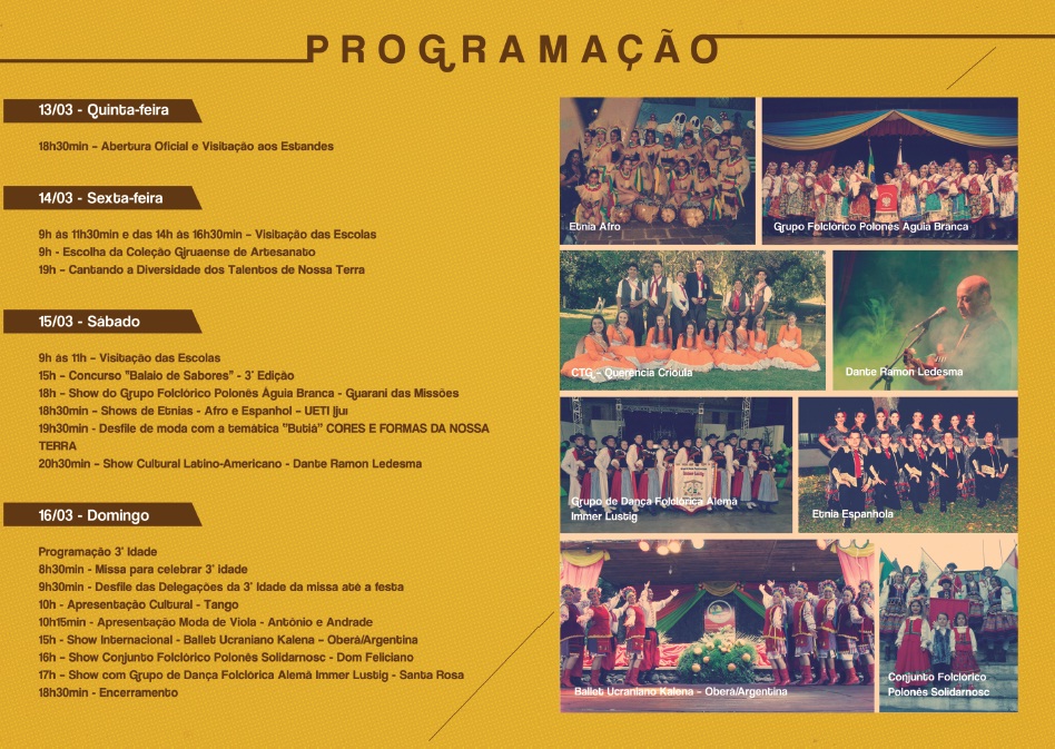 A abertura oficial da 8ª edição do evento acontecerá na quinta-feira, 13 de março, às 18h30min. Na sexta-feira pela manhã, será escolhida a Coleção Giruaense de Artesanato e à noite, acontecerá o "Cantando a Diversidade dos Talentos de Nossa Terra". Além de toda a programação cultural, a Festa contará com expositores giruaenses que apresentarão o melhor da gastronomia e do artesanato para a comunidade regional.