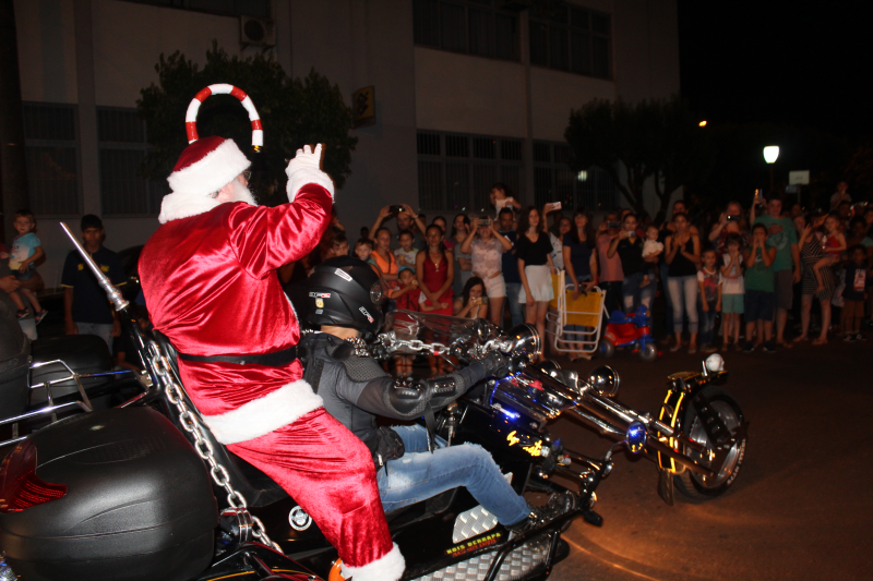 O mais especial da noite foi a chegada do Papai Noel, tão aguardado pelos pequeninos, que se surpreenderam com a inusitada chegada do bom velhinho, de triciclo motorizado acompanhado de um comboio de motoqueiros, no estilo rock in roll.