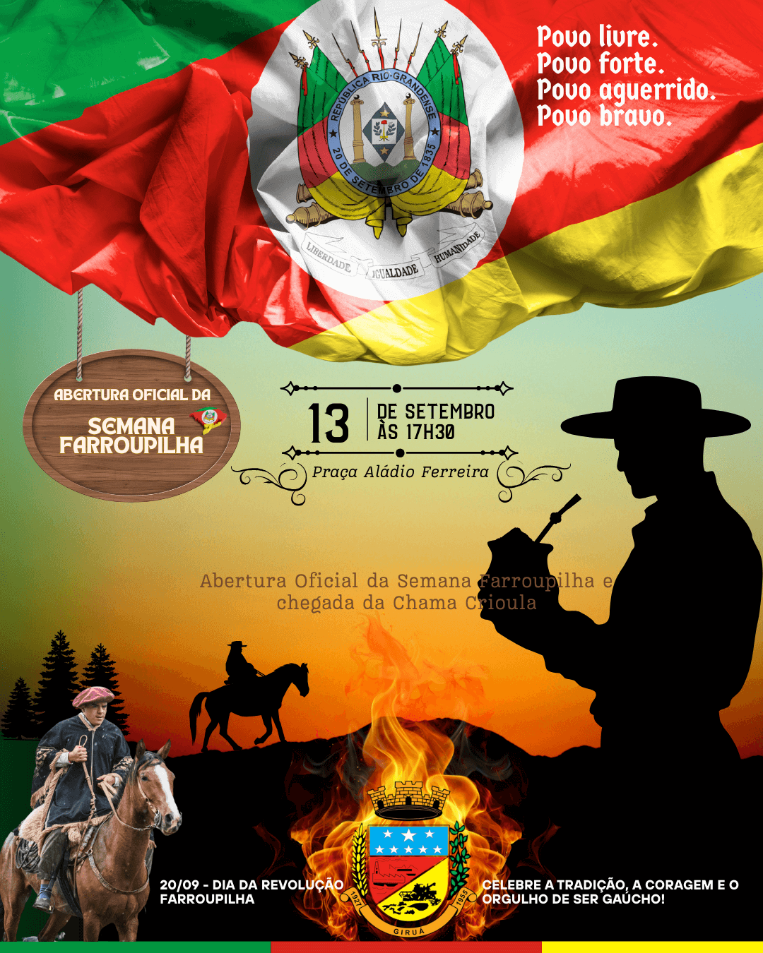 Em parceria com as entidades tradicionalistas do município, o Governo Municipal através da Secretaria de Educação e Cultura, convida a comunidade a participar das atividades da Semana Farroupilha, que celebra nossa cultura, tradição e orgulho gaúcho. No período de 13 a 20 de setembro, eventos marcarão momentos de aprendizado, convivência e festa para enriquecer a cultura riograndense.
