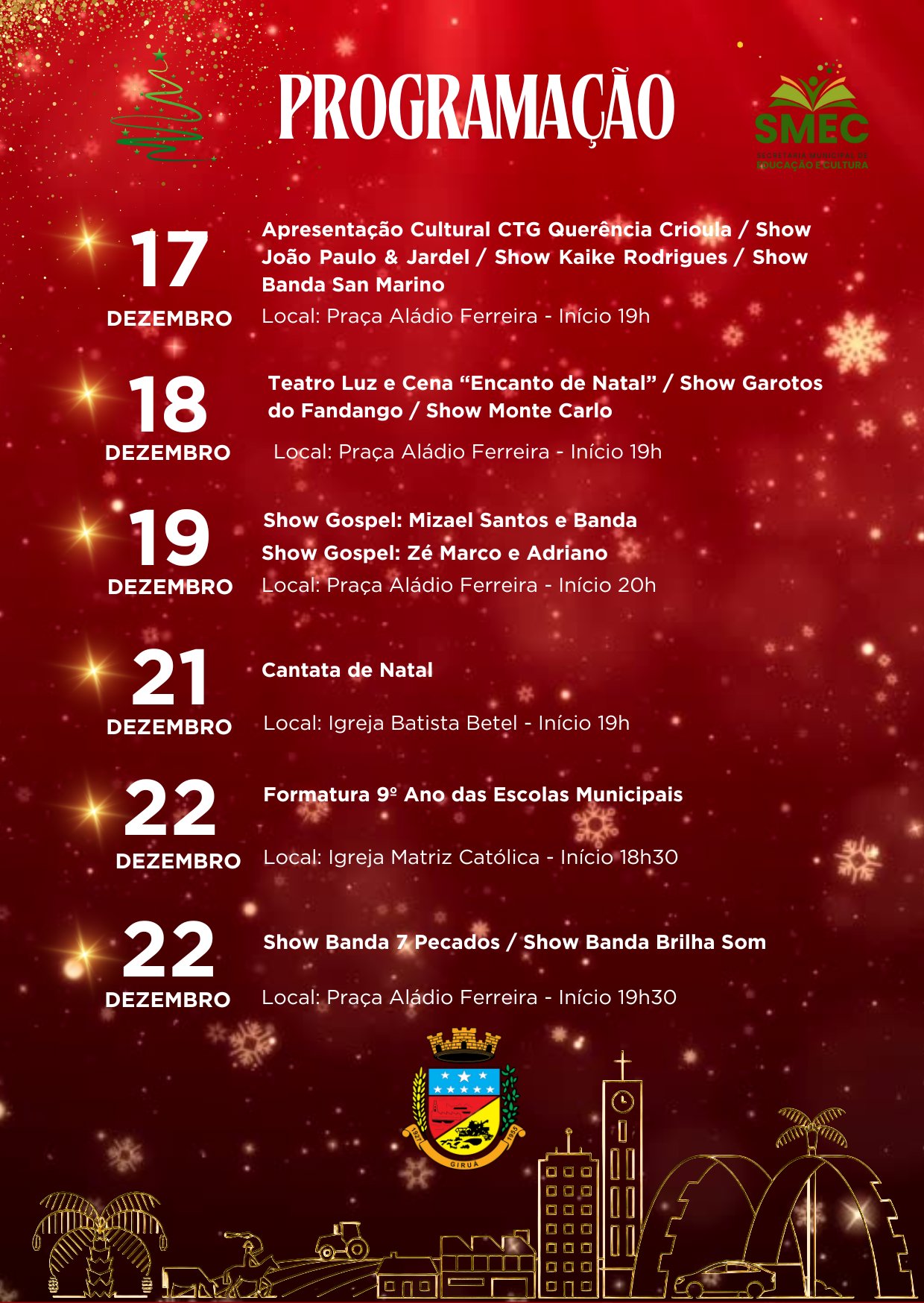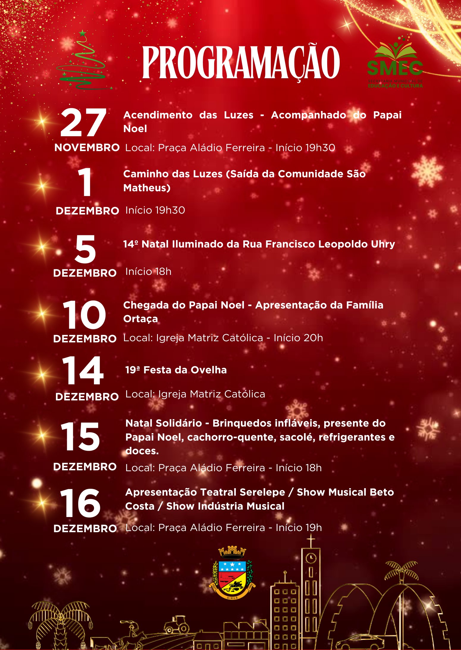 O Governo Municipal, por meio da Secretaria de Educação e Cultura, tem a alegria de anunciar a Programação Oficial do Natal 2025.