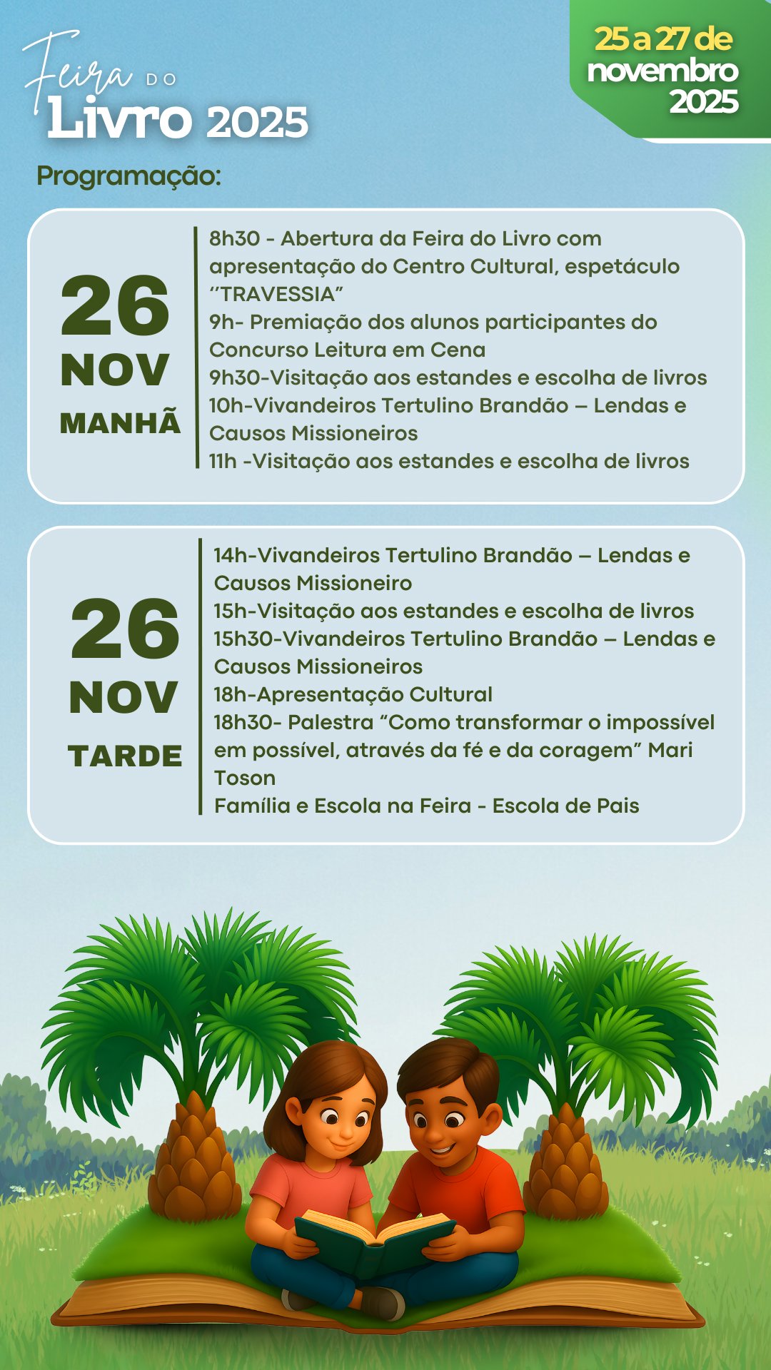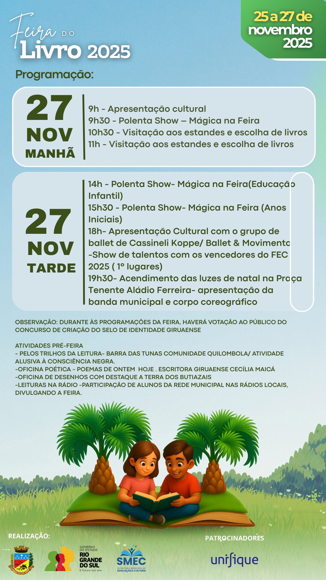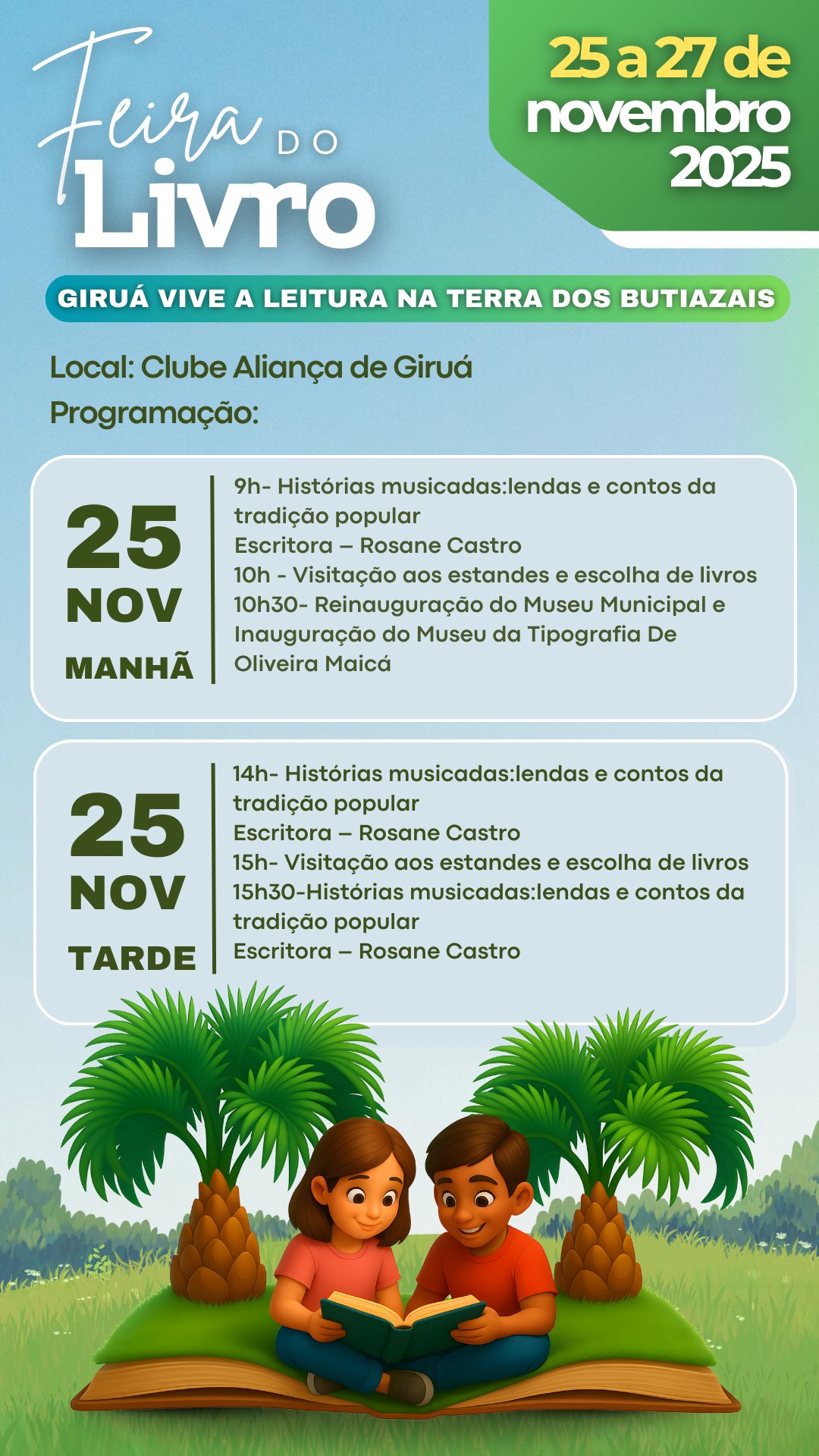 Nos dias 25, 26 e 27 de novembro de 2025, o Clube Aliança será palco de uma celebração especial: a Feira do Livro 2025, que chega iluminada pelo tema “Giruá vive e leitura na terra dos butiazais”. Em meio ao encanto dos nossos butiazais, leitores de todas as idades serão convidados a mergulhar em histórias que preservam memórias, fortalecem identidades e fazem pulsar a cultura giruaense. Venha viver essa experiência literária que une tradição, imaginação e o orgulho de pertencer a esta terra fértil em frutos e também em sonhos.