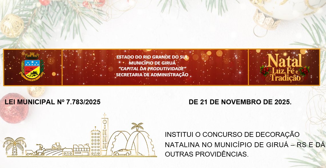 O Município de Giruá instituiu oficialmente, na última sexta-feira, 21 de novembro, o Concurso de Decoração Natalina, iniciativa que busca incentivar moradores e comerciantes a ornamentarem casas e vitrines durante o período de fim de ano. A proposta pretende transformar a cidade em um ambiente mais acolhedor, iluminado e festivo, reforçando tradições e valores associados ao Natal e Ano Novo, além de atrair visitantes e estimular o sentimento comunitário.