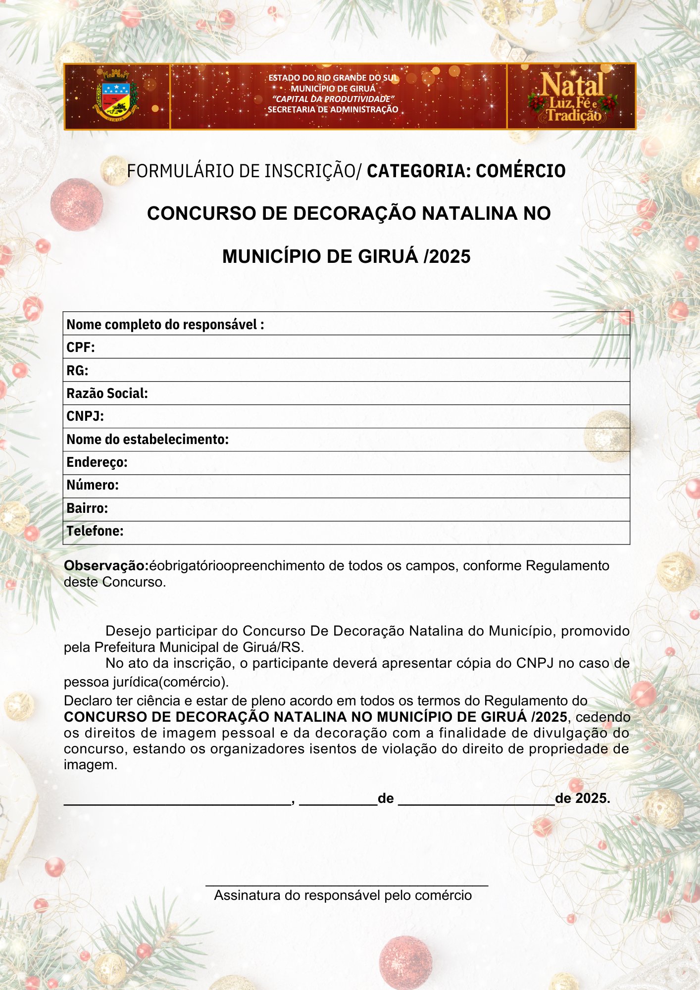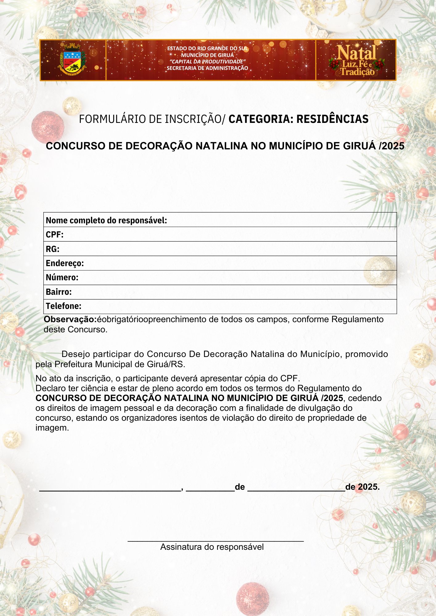 As inscrições ocorrerão de 1º a 10 de dezembro, no Centro Cultural Adelina Dias e, as decorações devem estar instaladas já no início do mês. O julgamento dos enfeites está previsto para o período de 10 a 20 de dezembro, com divulgação dos resultados no dia 22. Podem participar moradores domiciliados em Giruá, sendo avaliados critérios como criatividade, impacto visual da iluminação, harmonia estética e a capacidade de transmitir o espírito natalino por meio das decorações.