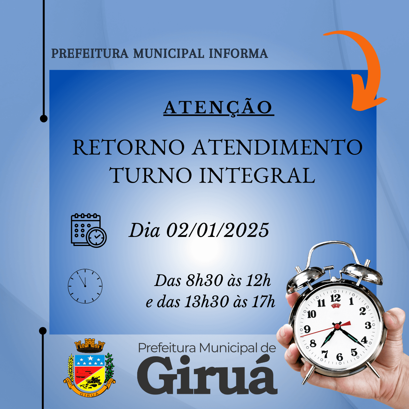 O Governo Municipal, retoma a partir do dia 2 de janeiro de 2025, o atendimento em turno integral no Centro Administrativo Bruno Edgar Schwerz e demais repartições do Executivo Municipal. O horário de funcionamento acontece das 8h30 às 12h e das 13h30 às 17h.