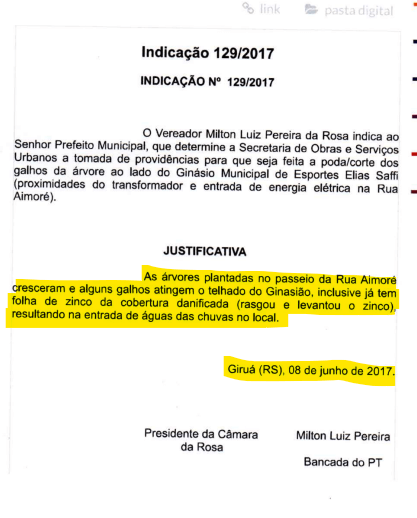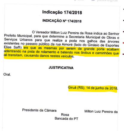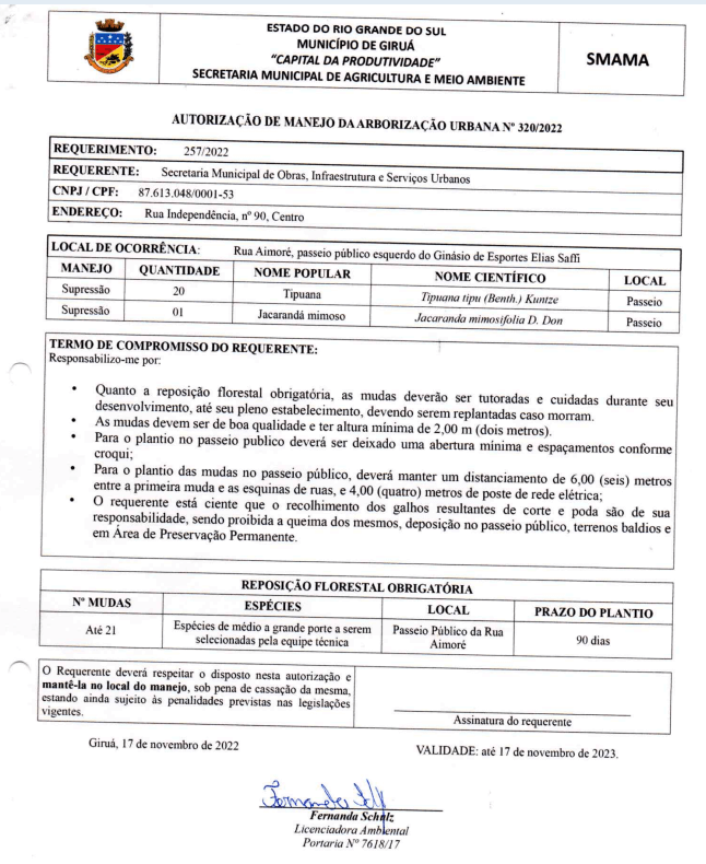 O Governo Municipal reitera que atua constantemente com campanhas de plantio de novas árvores no perímetro urbano e as vegetações que oferecem risco a sociedade, são substituídas atendendo todos os rigores das leis de proteção ao meio ambiente. Em recente manifestação em redes sociais, populares levantaram questões de legitimidade sobre a ação realizada, a qual salientamos foi inteiramente embasada dentro dos trâmites legais. Novas ações de arborização urbana deverão ser apresentadas em breve, especialmente na Semana do Meio Ambiente. A Prefeitura deverá aderir também, ao programa “Arborização Mais Segura”, uma proposta apresentada pela RGE aos gestores municipais e que deve contribuir ainda mais no espaço verde urbano.
