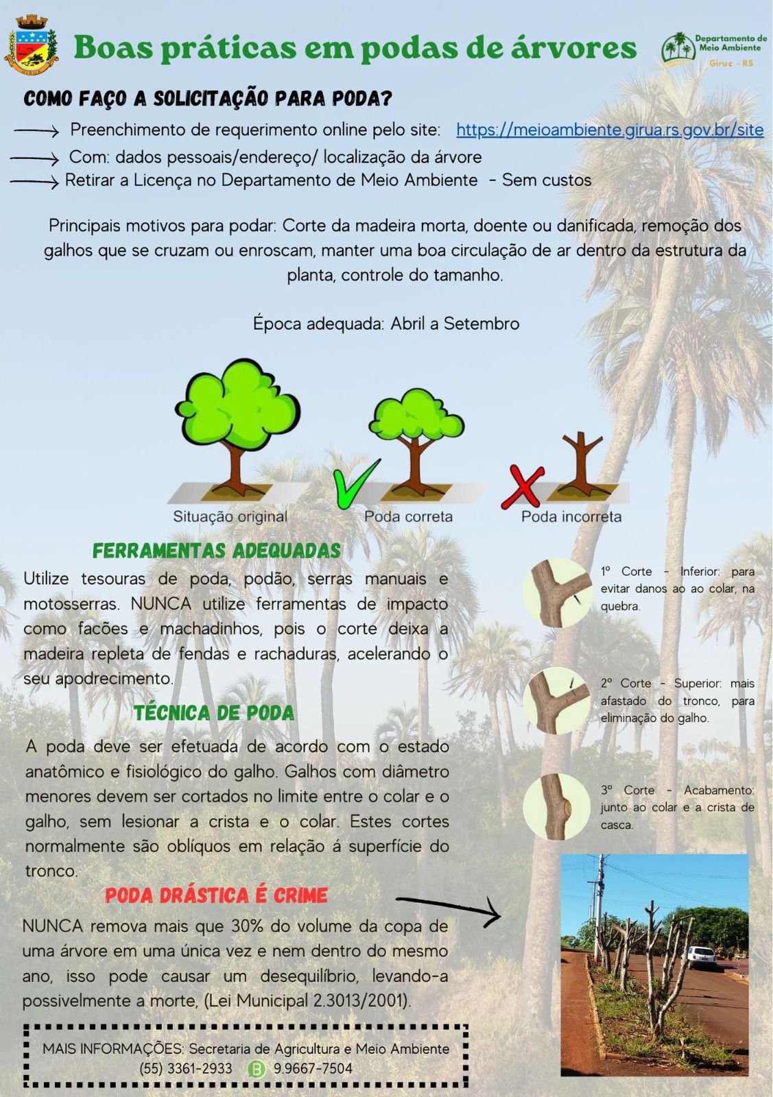O Governo Municipal por meio do Departamento de Meio Ambiente reitera as orientações que devem ser observadas pela população giruaense, no que tange aos cuidados com a arborização urbana, em especial as podas das árvores. Estamos no período adequado para realizar este manejo, entretanto é obrigatório solicitar autorização no órgão ambiental, não tem custos e é emitida na hora da solicitação. A poda na arborização urbana envolve a remoção de galhos mortos, doentes ou danificados, a redução de ramos que interfiram em fiação elétrica ou estruturas próximas e a eliminação de partes da árvore que represente um risco para a segurança pública.
