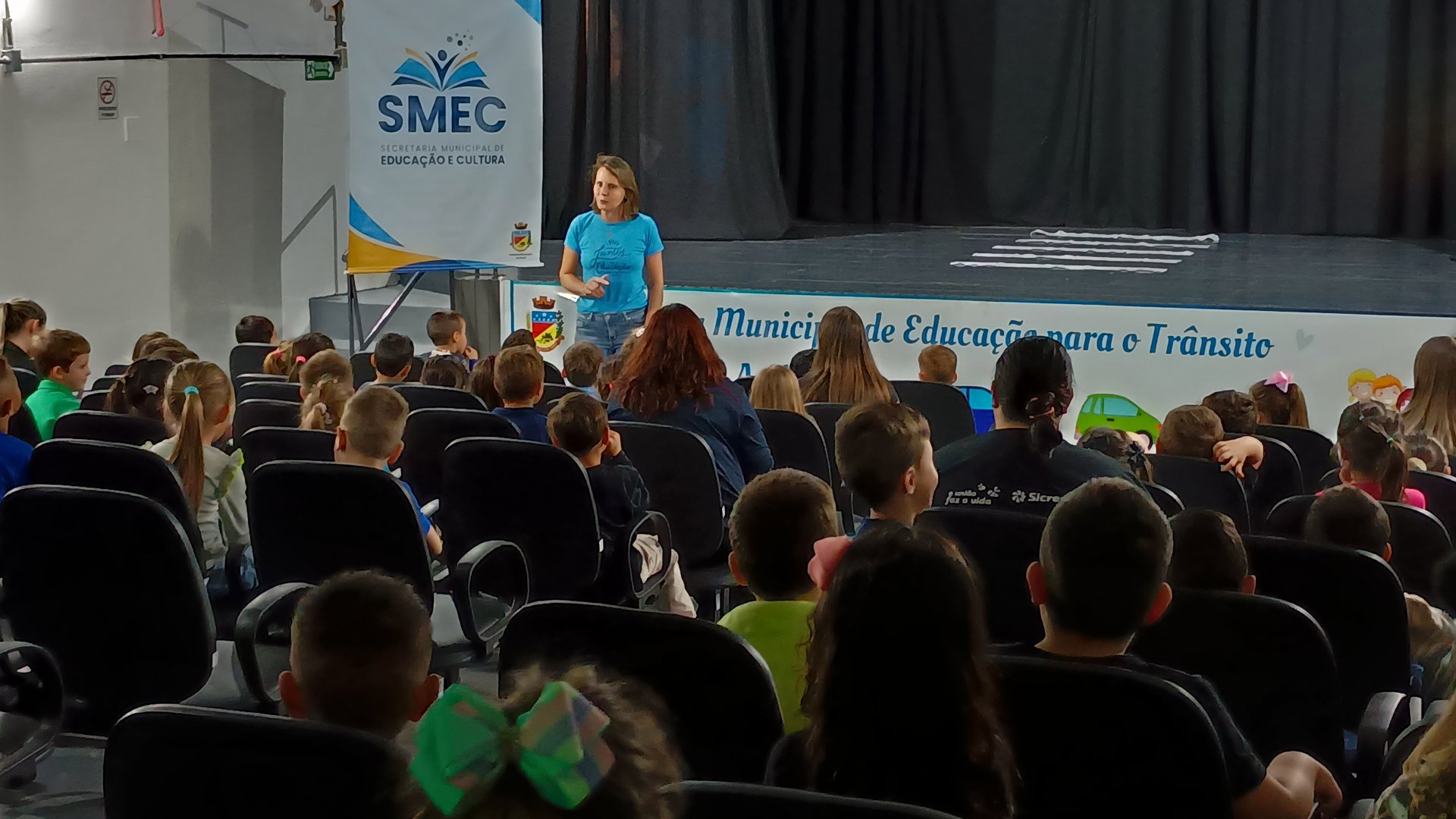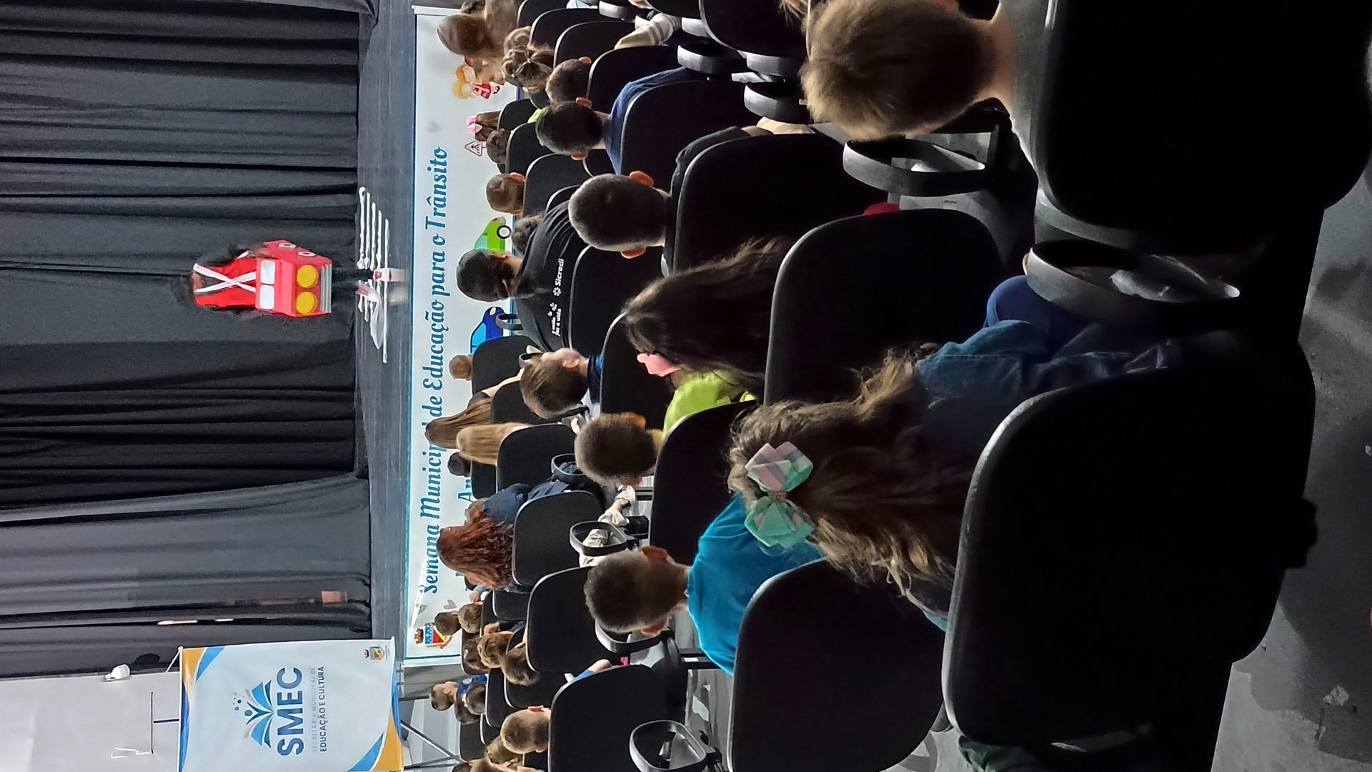A Semana Municipal de Educação no Trânsito, instituída pela Lei Nº. 7404/2023, está sendo marcada por propostas educativas que valorizam a participação das crianças e promovem a conscientização desde a infância. Na quarta-feira, 23 de setembro, no Centro Cultural Adelina Dias, os alunos do Jardim B das escolas municipais prestigiaram a peça teatral “A Cidade do Trânsito Maluco”, encenado pelos integrantes do grupo municipal de teatro.