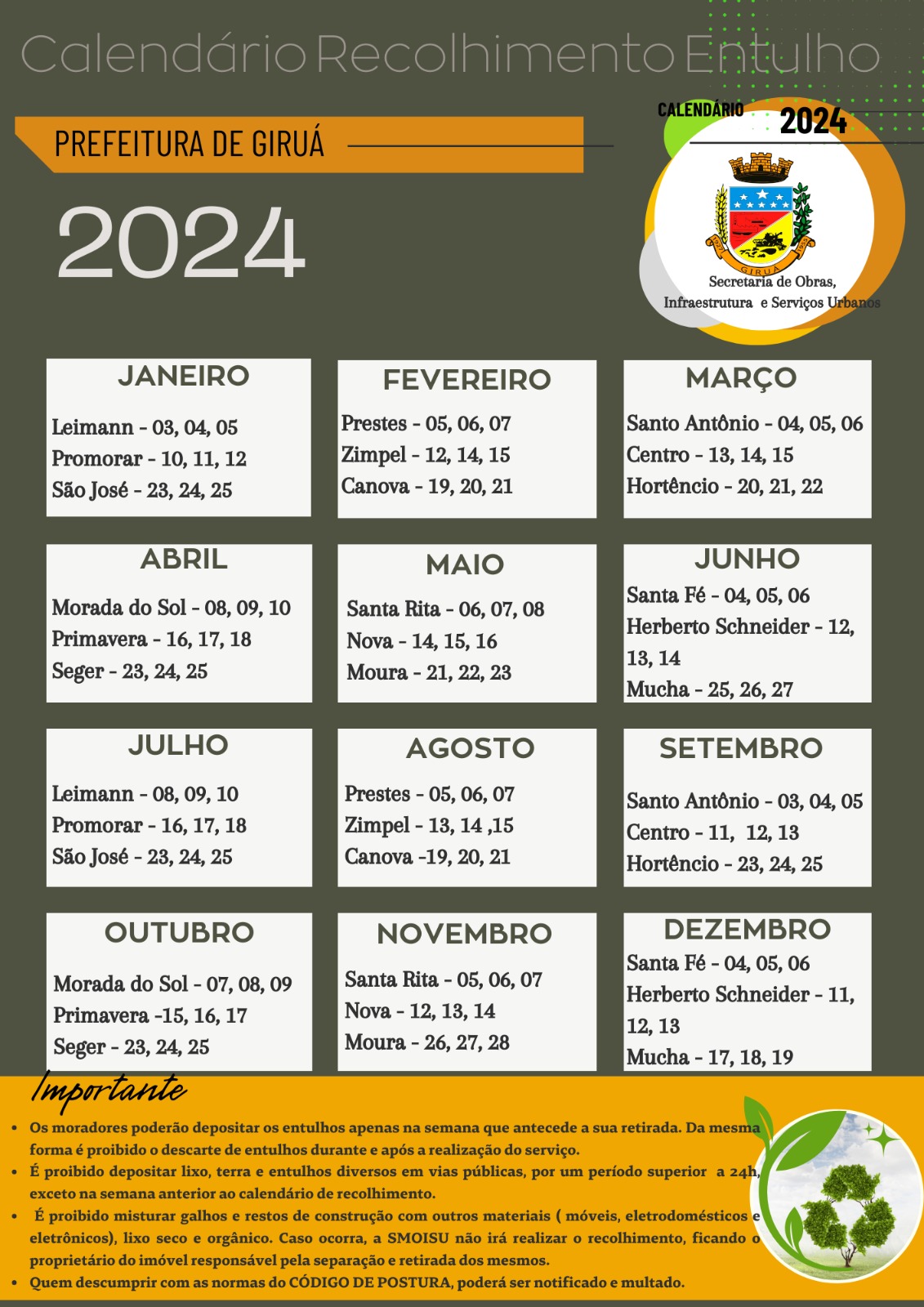 Ainda neste mês de maio podem dispensar entulhos os moradores dos bairros Santa Rita até o dia 6, Bairro Nova até o dia 13 e do Bairro Moura até o dia 20.