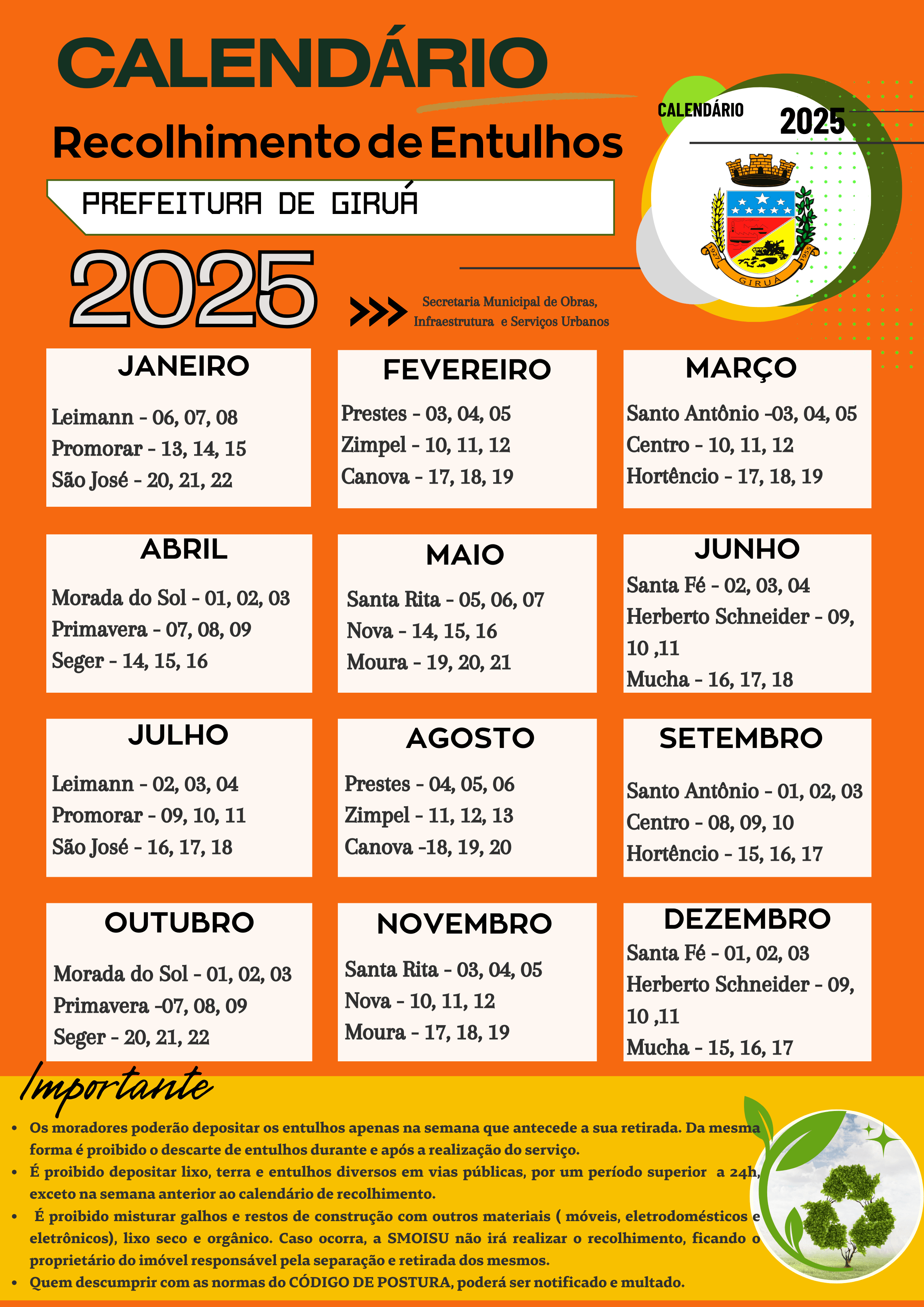 Comunidade giruaense, o Governo Municipal através da Secretaria de Obras, Infraestrutura e Serviços Urbanos, divulga o Calendário de Recolhimento de Entulhos – 2025. Fique atento ao período de recolhimento no seu bairro e auxilie na manutenção da limpeza, organização e beleza de nossas vias urbanas.