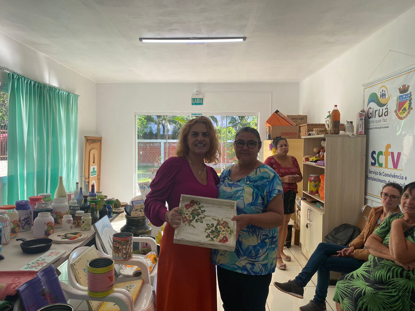 O secretário de Promoção Humana, Arlindo Pazini, a psicóloga Vera Ruwer e integrantes da equipe do Cras, acompanharam a oficina ministrada pela instrutora Márcia Martiny. Os trabalhos elaborados são doadas para as participantes que além de decorar suas residências, têm a oportunidade de comercializar as peças e obter renda extra.