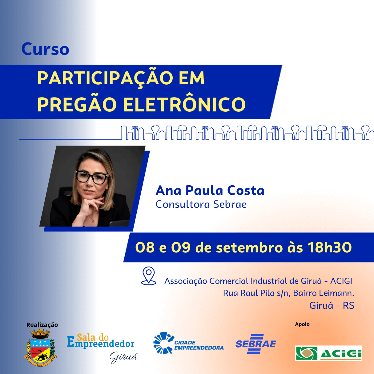 A Capacitação em Pregão Eletrônico para Fornecimento nas Compras Públicas acontecerá nos dias 08 e 09 de setembro, das 18h30 às 22h, na sede da ACIGI, localizada na Rua Raul Pila, s/n – Bairro Leimann, em Giruá. O curso será ministrado pela consultora do Sebrae, Ana Paula Costa, e abordará, de forma prática, como funciona o processo de licitação e como os pequenos negócios podem participar com mais facilidade.