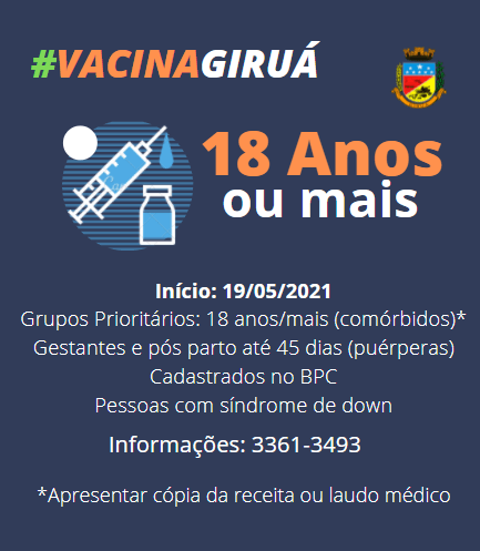 Nesta quarta-feira, 19 de maio, o Governo Municipal através da Secretaria de Saúde deu início à vacinação contra a Covid-19 para pessoas que apresentam alguma comorbidade, na faixa etária a partir dos 18 anos.