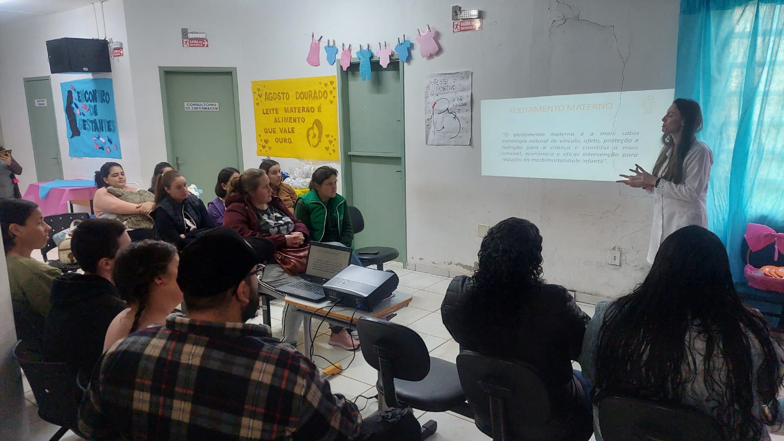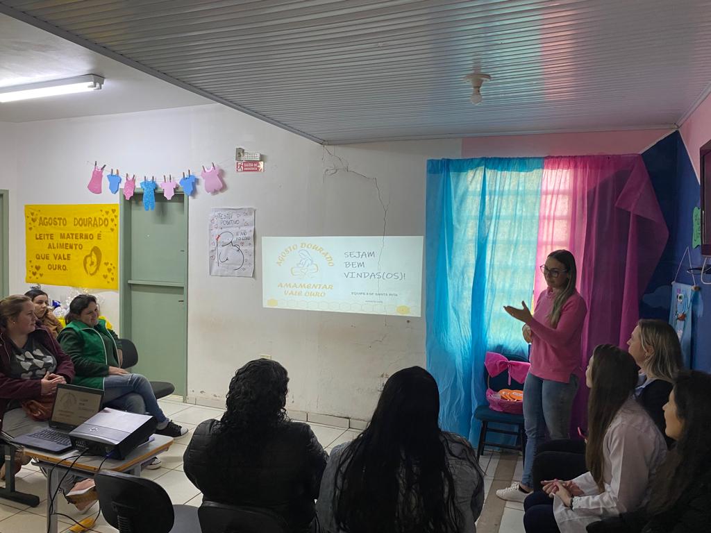 Na última sexta-feira, 18 de agosto, a equipe da ESF Santa Rita, promoveu um encontro com as gestantes, puérperas e acompanhantes, alusivo ao Agosto Dourado. Durante o encontro, a equipe explanou sobre os principais desafios da amamentação, através de uma roda de conversa e de uma dinâmica sobre "mitos e verdades sobre amamentação". A equipe também proporcionou um lanche coletivo, sorteio de brindes e entrega de uma lembrancinha para os presentes. As gestantes usuárias da unidade marcaram forte presença no evento, apesar do dia chuvoso, demonstrando o interesse nesse tema tão relevante para a saúde pública.