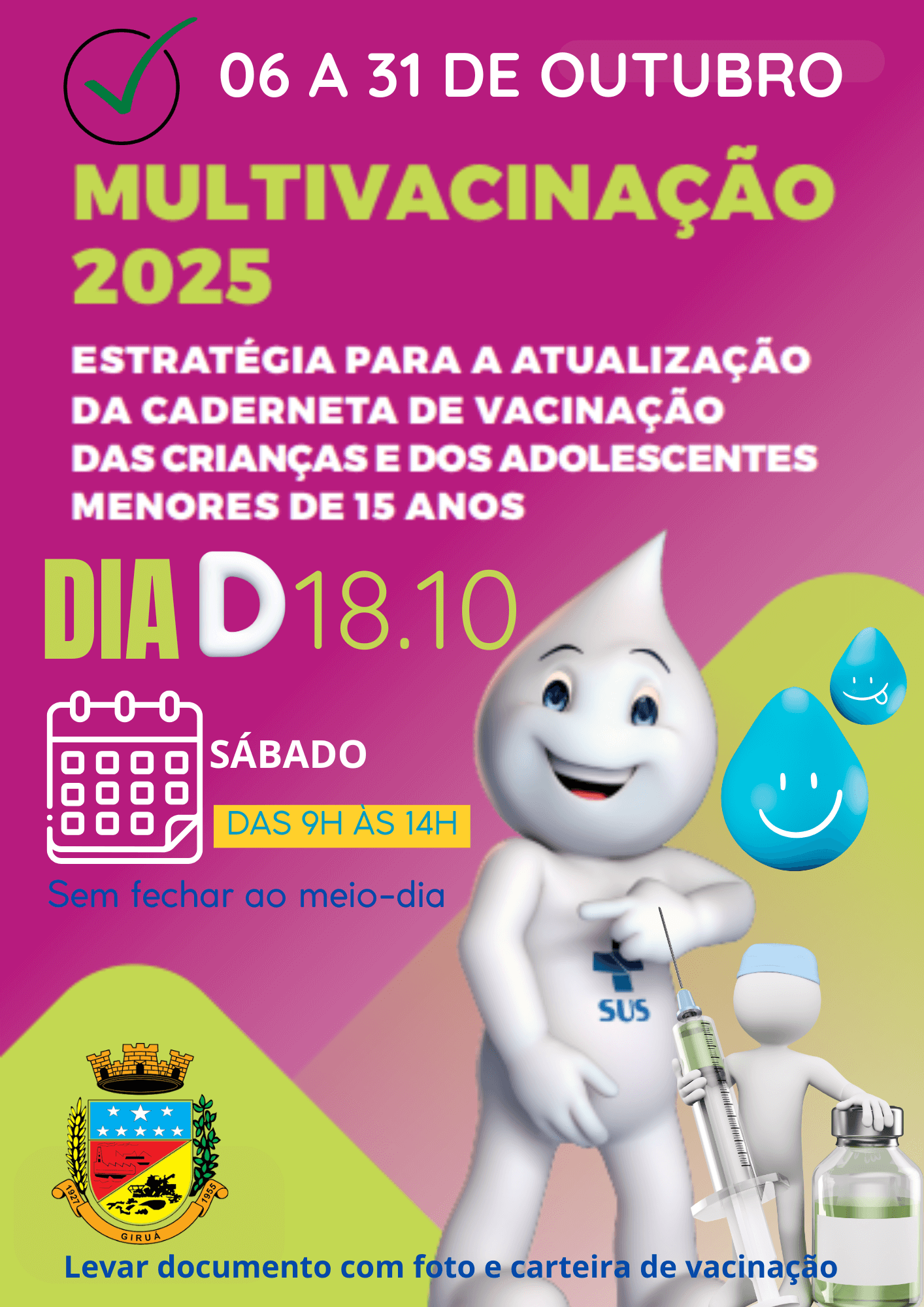 O Governo Municipal de Giruá, por meio da Secretaria Municipal de Saúde e em consonância com o Ministério da Saúde, deu início nesta segunda-feira, dia 06 de outubro, à Campanha Nacional de Multivacinação 2025. A ação segue até o dia 30 de outubro e tem como objetivo atualizar a caderneta de vacinação de crianças e adolescentes menores de 15 anos (até 14 anos, 11 meses e 29 dias), contribuindo para a elevação das coberturas vacinais e prevenção de doenças imunopreveníveis.