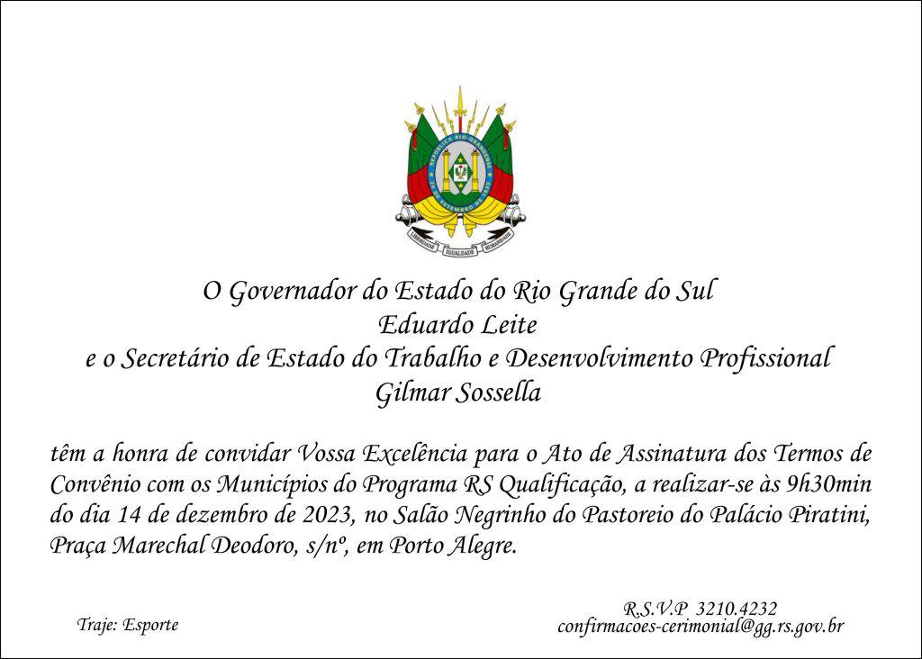 O importante ato aconteceu no Palácio Piratini, contou com a presença do governador do estado, Eduardo Leite, do secretário estadual de Trabalho e Desenvolvimento Profissional, Gilmar Sosella, demais autoridades, além da participação de dezenas de representantes de municípios gaúchos habilitados no programa.