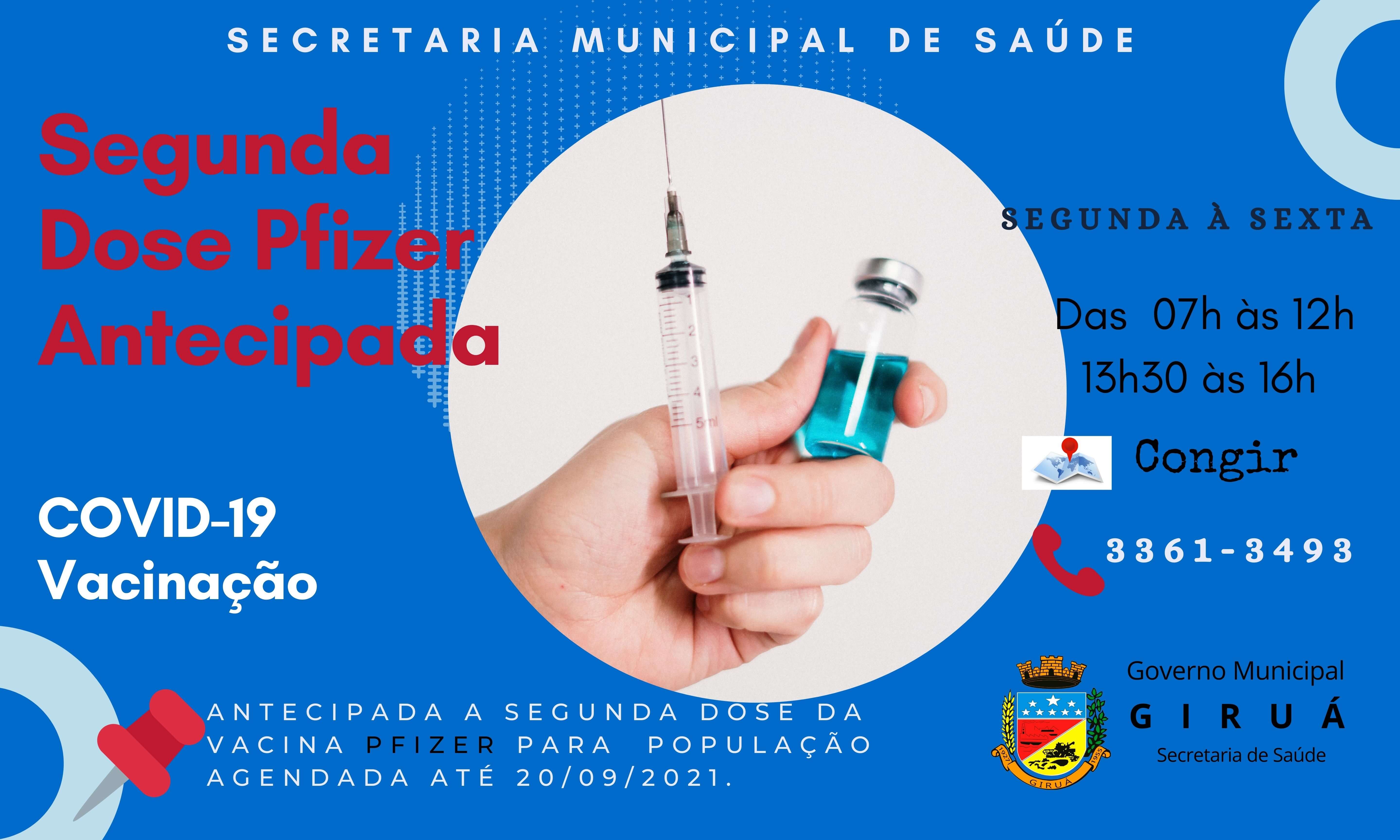 O Governo Municipal informa que a partir desta sexta-feira(27), a Secretaria de Saúde estará antecipando a vacinação contra a Covid-19, segunda dose Pfizer, para toda a população agendada até o dia 20/09/2021. A coordenadora de vacinas Eliana Fungueto, lembra a todos os cidadãos que ainda não realizaram o retorno para receber a segunda dose da vacina Covid-19 para ficarem atentos ao prazo da sua caderneta de vacinação.